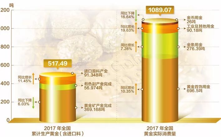 2017年度我国黄金产量426.142吨 黄金消费量1089.07吨