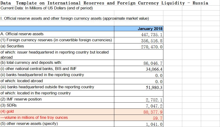 据俄罗斯央行2018年1月最新数据显示,俄罗斯官方黄金储备为59.7百万盎司。